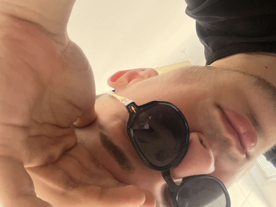 The scene depicts a close-up, low-angle portrait of an individual within an indoor setting in Sandanski, Bulgaria. The subject is a young male with pale skin, dark eyebrows, and short facial hair along the jawline. He is wearing black-framed sunglasses with dark, reflective lenses; the right temple piece features a distinct golden accent with an emblem. A dark t-shirt is visible on the subject's right side. His right hand is raised, with fingers slightly curled, covering part of his forehead and upper scalp. A silver-colored ring is present on the ring finger of the raised hand. The individual is looking downwards towards the camera. The background consists of a uniformly bright, light-colored surface, possibly a wall or ceiling. A faint reflection, consistent with a window or a light source with a grid-like pattern, is visible in the left lens of the sunglasses. A subtle, light-colored object, resembling a glass or a wall-mounted fixture, is partially visible on the far right side of the background.