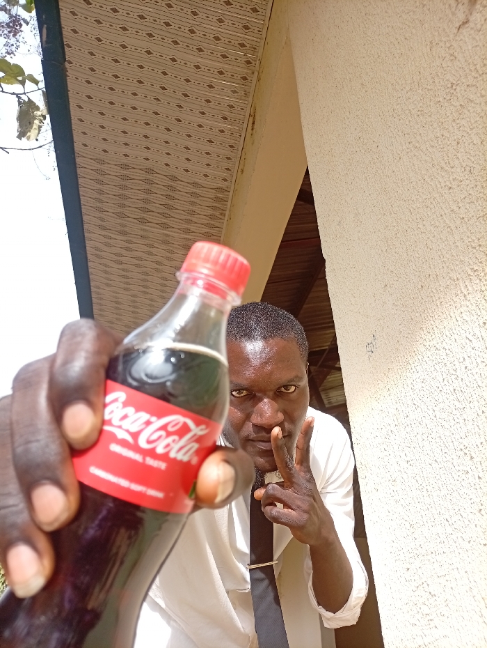 The scene is located in Kaninkon, Nigeria. A dark-skinned male individual, wearing a white long-sleeved shirt and a dark tie with a tie clip, is positioned right of center, looking directly at the viewer with a serious expression. His right hand is raised, forming a two-finger "V" gesture. In the immediate foreground, a dark-skinned hand holds a clear plastic Coca-Cola bottle with a red cap and red label, prominently displayed and out of focus. The background consists of a light-colored, textured stucco wall on the right and a patterned ceiling soffit with geometric designs on the upper left, adjacent to a bright outdoor sky and sparse tree foliage. The environment suggests an exterior building structure.