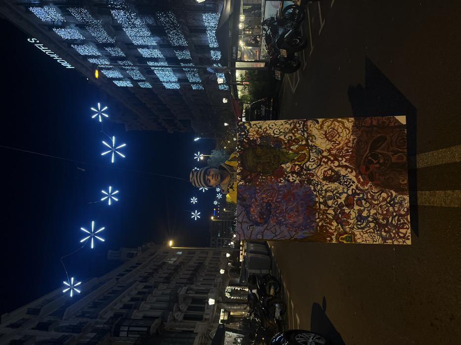 A nighttime street scene with a man holding a large abstract painting. The painting features a blend of purple, green, red, brown, and white hues. Buildings adorned with illuminated snowflake decorations flank the street. A motorcycle is parked alongside the street and nearby a building called 'HOHOTELS'. The photo appears to have been rotated.