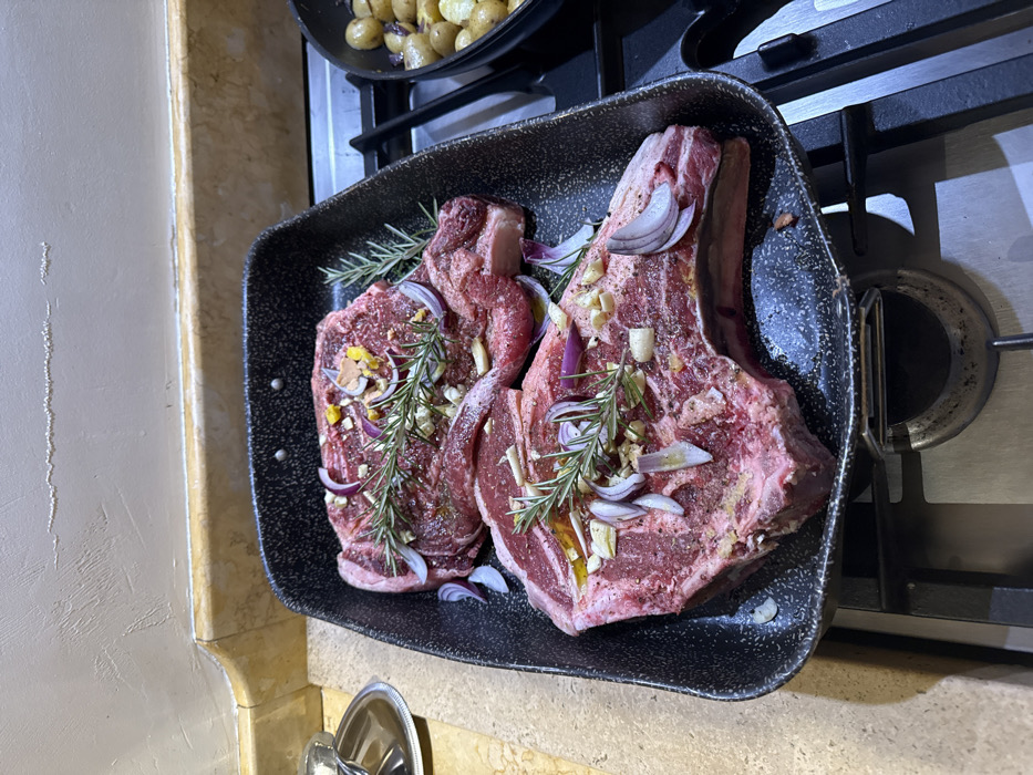Two raw, bone-in meat cuts are arranged on a black baking tray, seasoned with garlic cloves, rosemary sprigs, and sliced red onion
