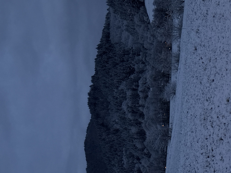 A landscape scene dominated by a snowy forest and a snow-covered field under a dark sky. The forest rises along the left side, its dense trees cloaked in white. Adjacent to the trees, a field stretches out, its surface entirely blanketed in snow. The sky is overcast with a muted blue-gray hue. Light spots are visible among the trees.