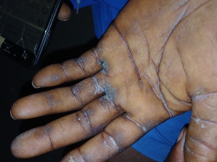 - "A close-up image taken in Zango-ndaji, Nigeria, displays the palm and fingers of a human right hand, exhibiting dark brown skin with areas of light grey, possibly dry or flaking skin, particularly prominent along the creases of the fingers and palm, and on the knuckles" by FM-Oh2n63, licensed under CC BY 4.0