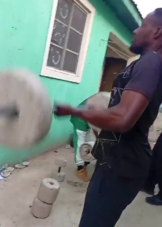 man performing a shoulder press with a barbell loaded with what appears to be concrete weights. He stands in an outdoor alleyway between buildings painted light green. The barbell and weights look homemade. Other people stand around him and there are concrete weights on the ground. The man struggles with the lift, pushing the barbell slowly overhead.