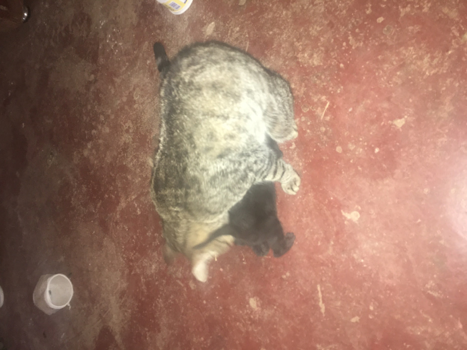 The image, taken in Limuru, Kenya, displays two felines on a reddish-brown floor under low-level illumination