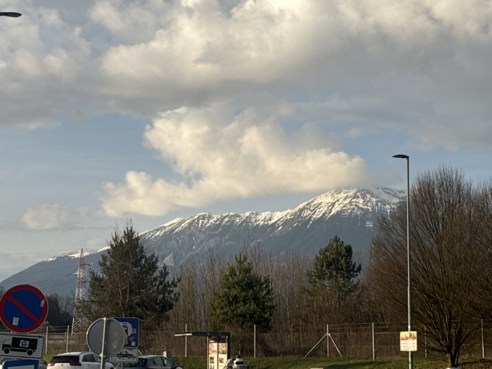 The scene depicts a wide outdoor view in Radovljica, Slovenia, under a partly cloudy sky with prominent white and grey cumulus clouds against patches of blue. In the background, a range of snow-capped mountains with visible rock faces and dark evergreen tree lines dominates the horizon. The midground features a dense line of bare deciduous trees, interspersed with several dark green coniferous trees, separated from the foreground by a wire fence. A lattice-structure power line tower is visible on the far left of the midground. The foreground reveals a paved area, likely a parking lot or road shoulder, occupied by several parked passenger vehicles, including a white car and a dark-colored car. Prominent street furniture and signs are present: on the left, a large circular blue sign with a red diagonal line through a white rectangle (indicating "no stopping" or similar restriction), stacked above a smaller white square sign depicting a truck with a camera icon. To the right, a tall, slender, dark grey street lamp stands erect. Partially visible is a structure resembling a bus stop or kiosk, featuring advertisements, and a yellow triangular warning sign with a black border and red symbol below the street lamp. No individuals are visible.