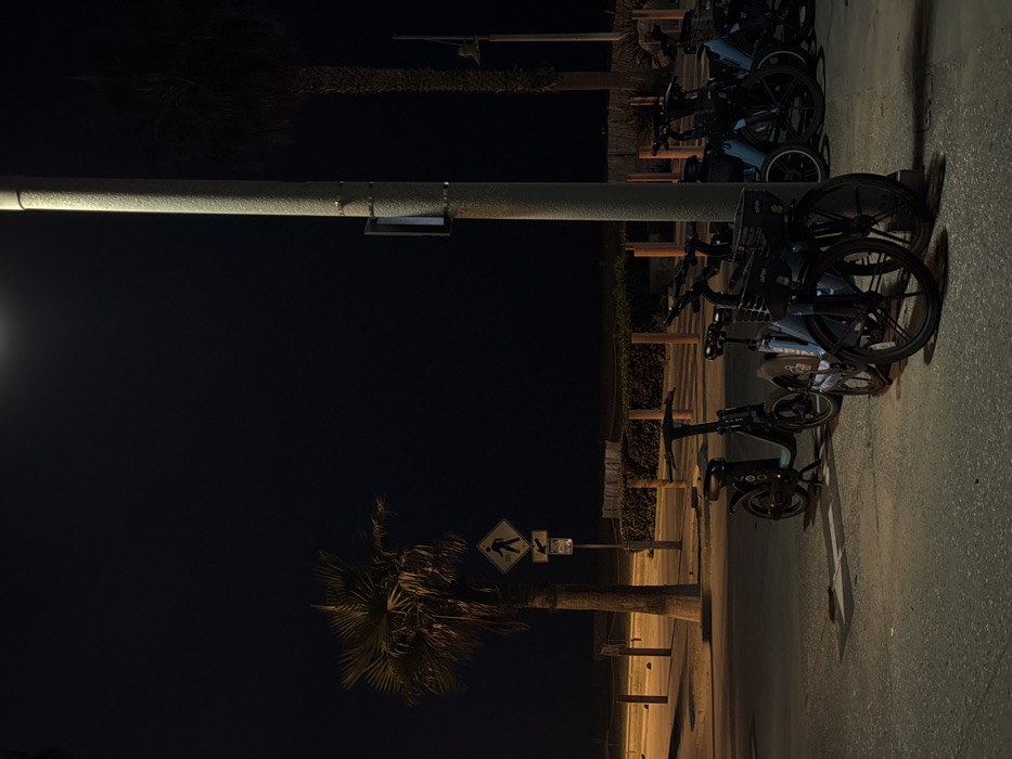 A nighttime shot reveals a row of rental bicycles parked on a sidewalk. A palm tree stands adjacent to a crosswalk sign. A street lamp illuminates the scene, while a second palm tree is visible in the background. The sky is dark and clear.