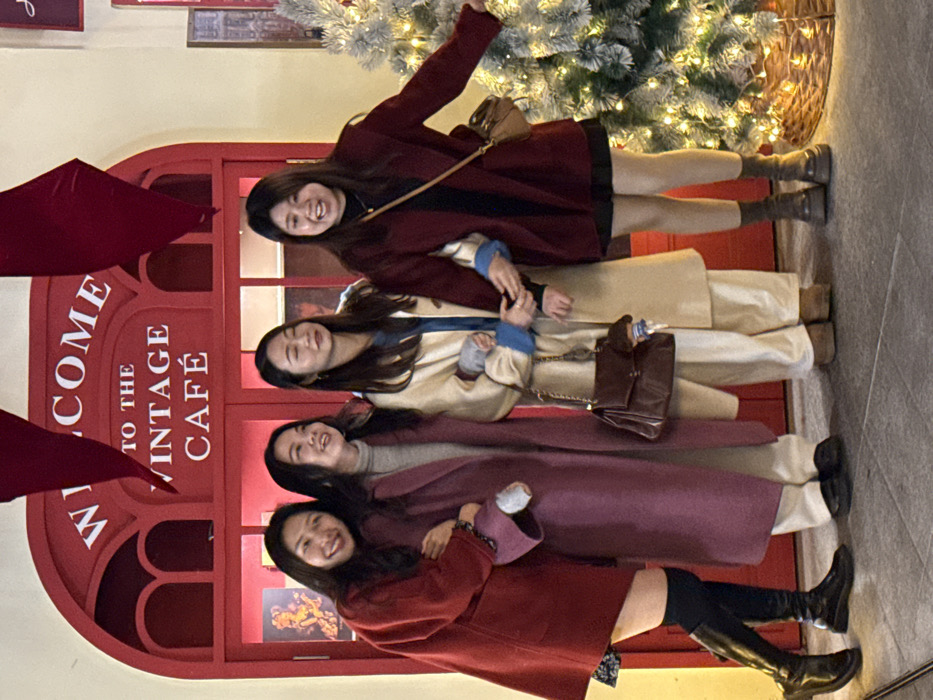 Four East Asian females are depicted standing closely together and interlinking arms in an outdoor urban setting in Liangjiang, China. They are positioned in front of a red building facade featuring a double door and white lettering that reads "WELCOME TO THE VINTAGE CAFÉ". Red velvet-like fabric is draped decoratively above the entrance. From left to right: 1. A female with long dark hair, smiling, wearing a dark red mid-length overcoat, a dark skirt, and black knee-high boots. Her right arm is linked with the second female's left arm. 2. A female with long dark hair, looking towards the right with a smile, wearing a light grey turtleneck, a long plum-colored overcoat, light-colored trousers, and dark flat shoes. Her left arm is linked with the first female's right arm, and her right arm is linked with the third female's right arm. 3. A female with long dark hair, eyes partially closed with a subtle smile, wearing a light beige long overcoat over a light blue collared shirt, light-colored trousers, and light brown flat shoes. She carries a dark brown shoulder bag with a gold chain strap. Her right arm is linked with the second female's right arm, and her left arm is linked with the fourth female's left arm. 4. A female with long dark hair, mouth open as if speaking or laughing, wearing a dark red short overcoat, a black top/dress, a black mini-skirt, light-colored tights/stockings, and dark brown platform ankle boots. Her left arm is linked with the third female's left arm, and her right arm is extended slightly outward. To the right of the group, a decorated Christmas tree with frosted branches and warm white lights, resting in a wicker basket-like base, is visible. The ground is a paved or tiled surface. The scene suggests a festive, possibly evening, outdoor environment.