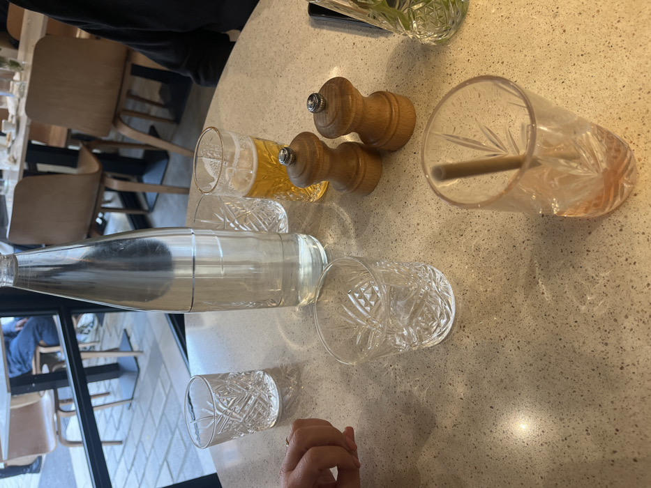 The image displays a tabletop scene within a restaurant or cafe, likely located in Aix-en-Provence, France. **Subjects and Objects:** On a light-colored, speckled table surface, a tall glass bottle, approximately half-filled with clear water, stands centrally. To its left, an empty, lowball-style glass with an etched pattern is visible. Another similar empty glass is positioned further down and to the left. To the right of the water bottle, a pilsner glass containing a golden-yellow liquid, consistent with beer, is present. Adjacent to the beer glass are two light-brown, wooden pepper and salt shakers with silver tops. In the lower right foreground, a partially consumed drink in an etched glass, showing a small amount of pinkish liquid and containing a light-colored straw, is seen. **People and Actions:** A person's left hand, adorned with a ring on the fourth finger, is visible in the lower-left corner, resting near one of the empty glasses. A partial view of a person's torso, wearing a dark garment, is visible on the right side of the table, suggesting a diner. **Environment:** The background reveals the interior of a dining establishment with light-colored wooden chairs and dark-legged tables. Beyond the interior, a large window or glass partition provides a view of an outdoor paved area, suggesting a street or sidewalk, with additional seating visible. The overall lighting is bright, casting some shadows on the table surface.