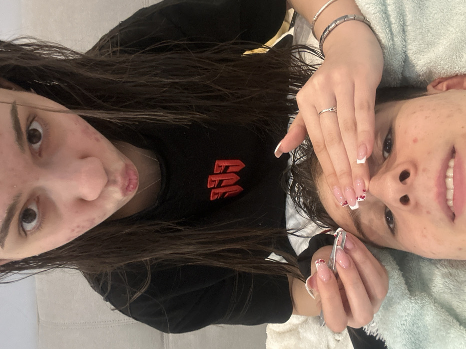 The scene takes place indoors, likely within a domestic residence in Kozloduy, Bulgaria. The exact street address or specific room type within Kozloduy is not discernible from the visual information provided. The image features two young adult individuals engaged in an eyebrow grooming activity. A female is positioned in the upper portion of the frame, leaning over a male positioned in the lower portion. The female has long, dark, wet hair and a face with visible skin blemishes. Her lips are puckered, and her gaze is directed towards the camera. She wears a black t-shirt with a red, three-character stylized logo on the chest and a thin silver necklace. Her left hand, adorned with long, French-manicured nails featuring small red heart designs, holds a pair of silver tweezers over the male's right eyebrow (viewer's left). Her right hand, similarly manicured and wearing a silver ring on the ring finger and multiple silver bangles, is pressed against the male's forehead, obscuring his left eye area. The male, visible from the nose upward, has short, dark hair that appears wet or styled. His face also presents visible skin blemishes. He is looking directly at the camera with a slight smile. He is partially covered by a light blue towel or blanket. The background shows a light-colored, upholstered surface, consistent with a sofa or bed headboard, indicating a residential environment.
