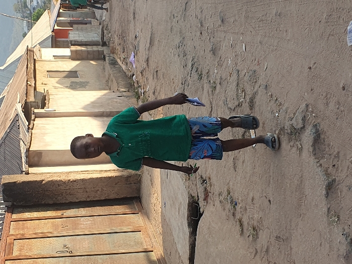 The image depicts an unpaved dirt road scene in Lokoja, Nigeria, under clear daylight conditions with strong shadows. A young male, wearing a green polo shirt, blue patterned shorts with leaf designs, and dark slide sandals, walks towards the viewer. He holds a thin green object, possibly a pen, in his left hand, and a folded white paper or small booklet in his right hand. His gaze is directed forward. The ground consists of reddish-brown dirt, uneven and marked by tire tracks, scattered small rocks, and minimal dry vegetation. To the left, a concrete slab or gutter edge is visible alongside a large, rusted metal gate with a mesh pattern, adjacent to a thick concrete pillar. To the right, a row of single-story buildings lines the road. These structures feature unpainted, light-colored concrete walls and corrugated metal roofs, with visible rectangular window openings. Overhead utility wires are present. In the far distance on the right, a partially obscured figure, possibly on a two-wheeled vehicle, can be seen, with hazy light-colored hills or mountains forming the horizon.