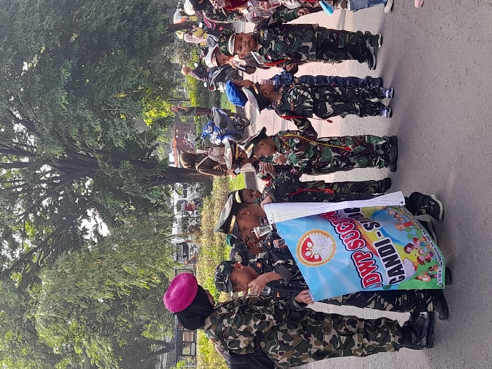A group of children dressed in military-style camouflage uniforms are walking in a line, possibly as part of a parade or celebration. The children are holding a banner with the words "DWP SUCI-SUCI CANDI-SUCI" written on it. Some of them are wearing hats, and one person wears a pink beret. The scene unfolds outdoors, with trees visible in the background.