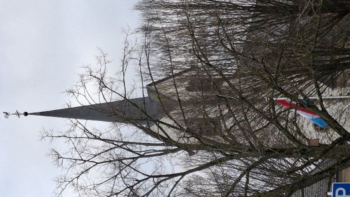 A spire tops a stone building, likely a church, obscured by the branches of a bare tree. A weather vane sits atop the spire. The building's roof is gray, blending with the overcast sky. A flag with horizontal red, white, and light blue stripes hangs amidst the branches. A parking sign is partially visible at the bottom right of the image.
