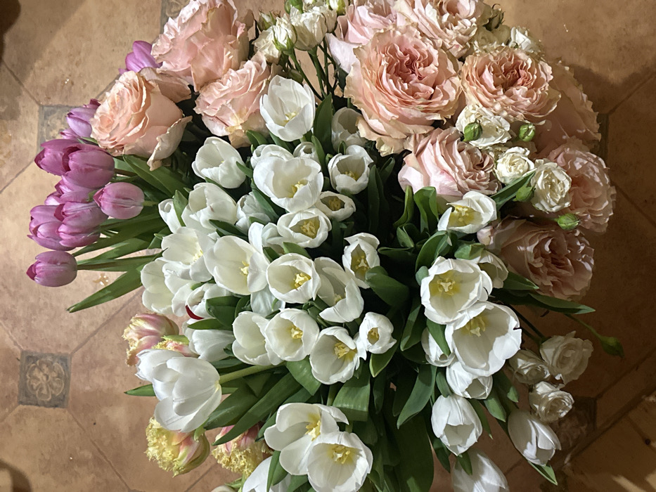 - "The image displays a dense floral arrangement set on a light brown tiled surface in Базарово, Russia" by FM-2t2Dl2, licensed under CC BY 4.0