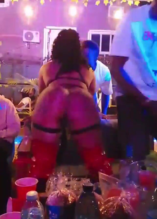 The video depicts a plus-size woman wearing a black strappy bikini, red leggings, and black boots, twerking and dancing on a table in an outdoor setting, possibly a party