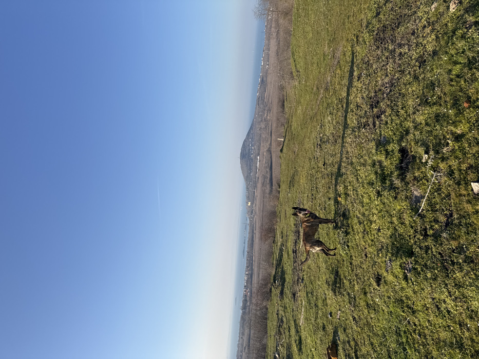 The image depicts an elevated, outdoor landscape within Atiya, Bulgaria, under a clear, bright blue sky. A brindle-patterned dog, consistent with a Belgian Malinois type, stands in the lower-left quadrant on an uneven grassy slope. The dog is positioned with its body slightly angled to the right, its head turned facing the camera, mouth slightly open with the tongue visible, and its tail raised. The immediate foreground comprises green grass interspersed with patches of exposed earth and minor debris. The midground features rolling hills covered in sparse, dry vegetation and some bare deciduous trees. In the background, a large body of water, consistent with the Black Sea, is visible stretching across the horizon. A coastal settlement with numerous structures borders the sea, extending along the shoreline. A prominent, conical-shaped hill rises centrally in the background, with additional distant buildings discernible near its base and along the adjacent coastline. A faint contrail is visible in the upper-right portion of the clear sky. No human subjects or explicit interactions are present.