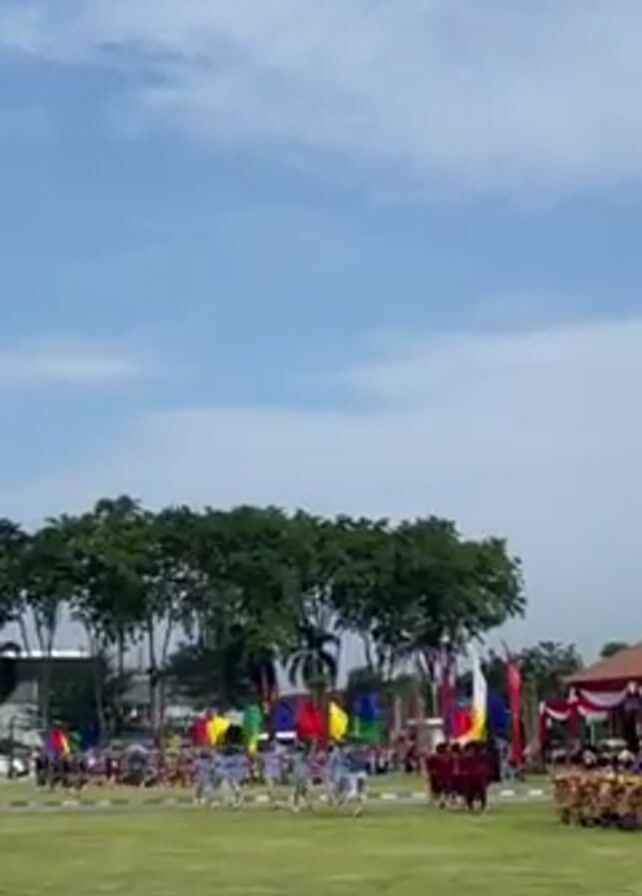 A wide shot depicts a group of young people performing a drill routine on a grassy field, under a blue sky with scattered clouds. The field is marked by a low, blue and white border, and surrounded by mature trees and a building with a distinctive roof. The performers, who are wearing colorful uniforms, are moving in a coordinated manner. In the background, some people in traditional attire are also visible, seemingly observing the performance. A row of colorful flags is present, adding to the overall festive atmosphere.