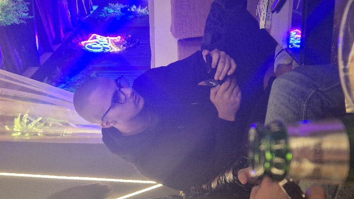 This vertical image depicts an indoor scene within a dimly lit establishment in Isperih, Bulgaria. An adult male, with a shaved head and wearing glasses, a dark hooded sweatshirt, and blue jeans, occupies the central midground, seated on a light-colored sofa. He is actively engaged with a black smartphone, holding it with both hands and directing his gaze downwards. The left side of the frame partially shows the arm of a second individual, wearing a black leather or puffer jacket. In the immediate foreground, a blurred green glass bottle with a metallic cap is visible, positioned on a dark, reflective table. Also on this table are a white and red pack of cigarettes and a small, illuminated decorative object displaying blue and red light patterns. The background features strong blue neon illumination, highlighting suspended artificial greenery and visible wooden ceiling beams. A partially obscured neon sign, featuring a star graphic and script text, is affixed to a background structure. Further background elements include a sheer, light-colored curtain and a vertical strip light on the far left. The overall atmosphere is characterized by subdued ambient lighting punctuated by vibrant neon accents.
