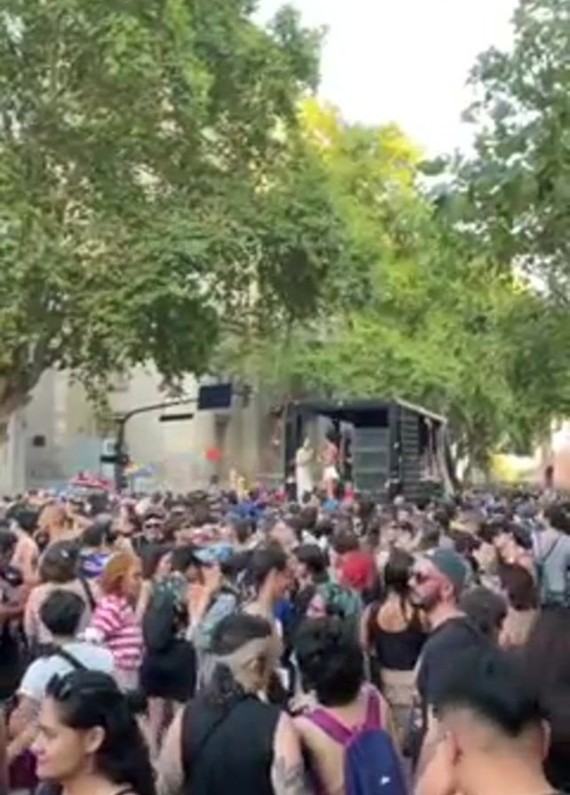 The video depicts a large crowd of people gathered on a city street, with trees lining the sides of the road and buildings visible in the background. A dark truck or container with performers standing on top is positioned in the middle of the crowd. The performers are dressed in light-colored clothing and seem to be entertaining the crowd, who are densely packed together and facing the stage. The camera angle is slightly low, looking up towards the performers. The overall atmosphere appears festive and lively. Confetti or other small objects are in the air.
