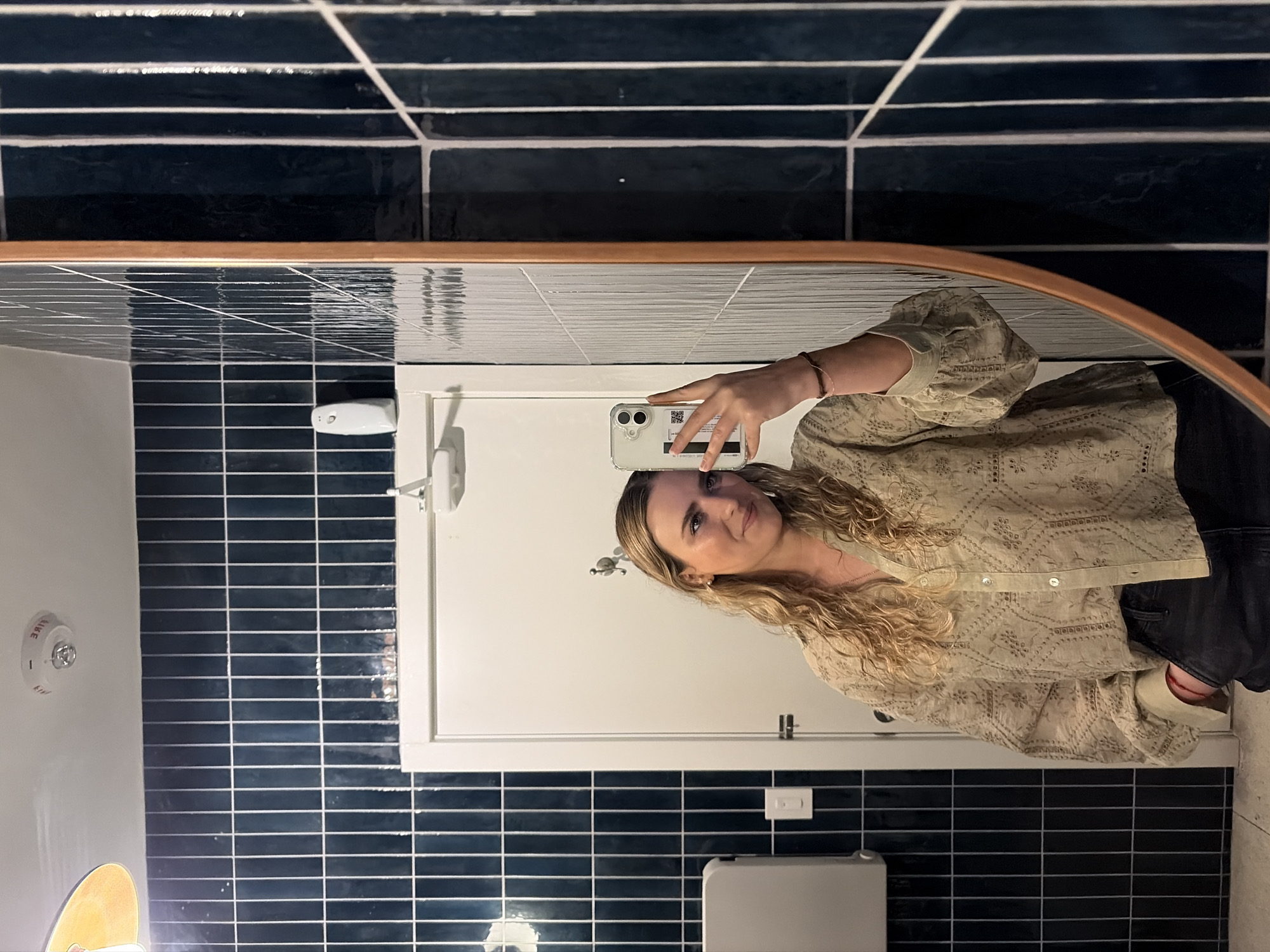 A person is taking a selfie in a bathroom mirror. The bathroom has blue rectangular tiles on the walls. There is a white door and toilet in the reflection. A round mirror is also visible. Based on tile style and color combination, as well as bathroom fixture design, this appears to be taken in a business or hotel bathroom, and given the user's location as Coral Gables, United States of America, it is likely taken in a commercial bathroom in that city.