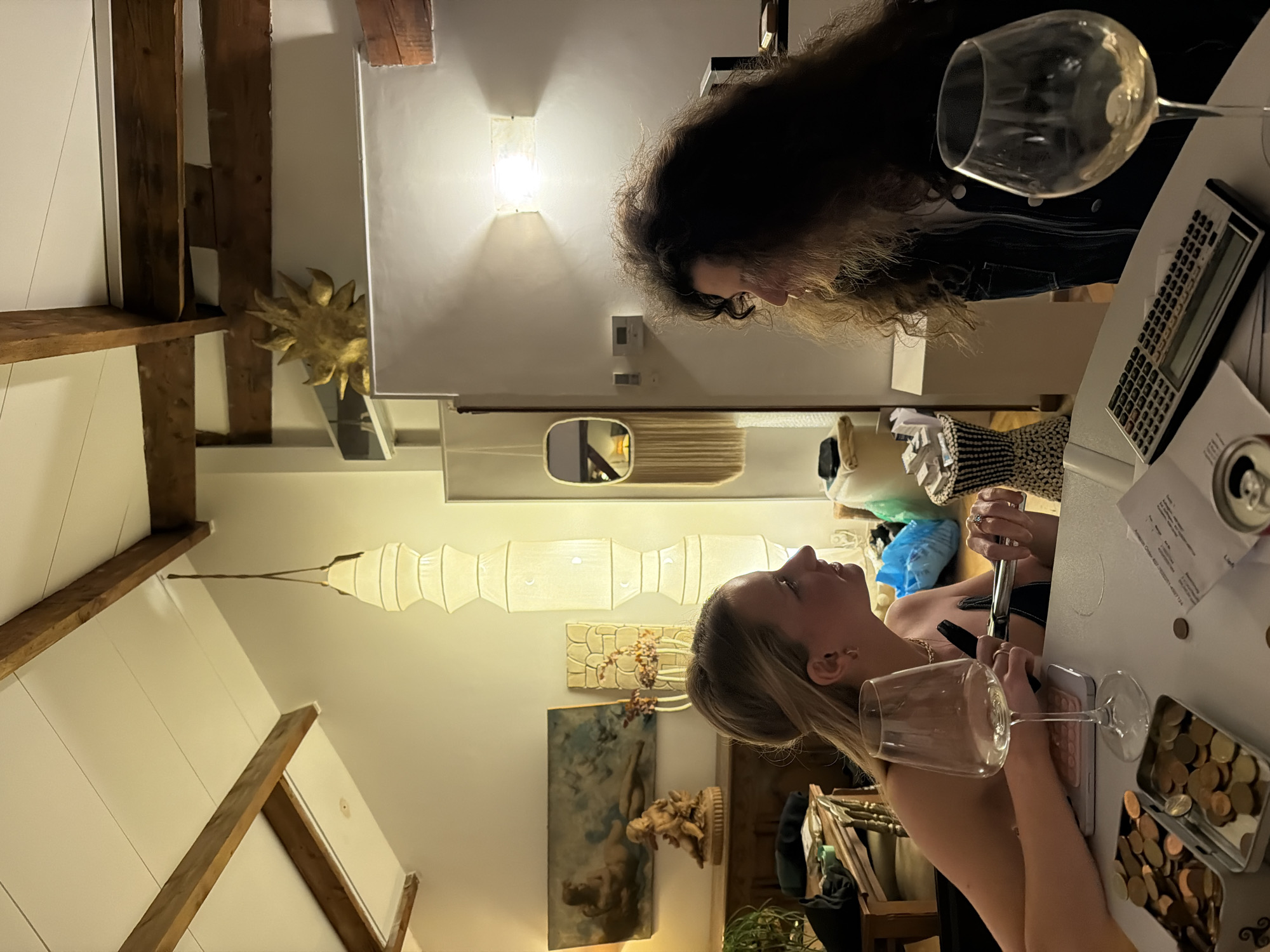 Two women are seated at a table in an interior setting. The woman on the left has blonde hair and is wearing a dark top, while the woman on the right has dark curly hair and is wearing glasses. Both have wine glasses nearby, and there are various objects on the table, including a calculator, a metal box filled with coins, papers, and a can. The background reveals architectural details like wooden beams, a light fixture, and a mirror. The room features artwork on the walls. Based on the architectural style and the presence of French coins, it is likely that the location is in Paris, France.
