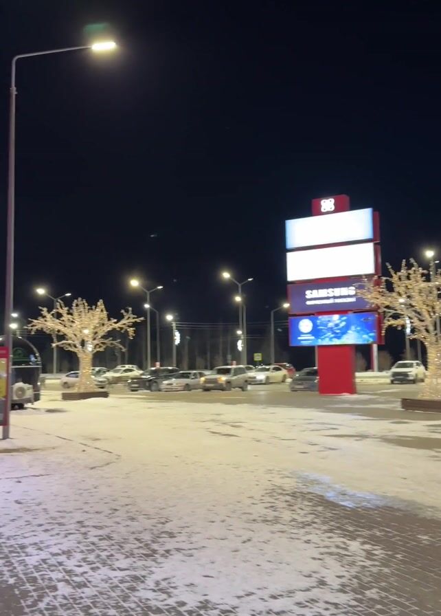 The video depicts an outdoor scene at night, possibly a parking lot or open space in front of a commercial building. The ground is covered in a mix of snow and pavement. Several cars are parked in the lot, illuminated by streetlights. A large, red sign structure is visible, featuring several illuminated panels. One panel displays the Samsung logo. Flanking the sign structure are two trees decorated with strings of lights, giving them a glowing appearance. Additional streetlights are spaced throughout the area. A sign advertising auto services is also visible on the left. The sky is dark and clear.