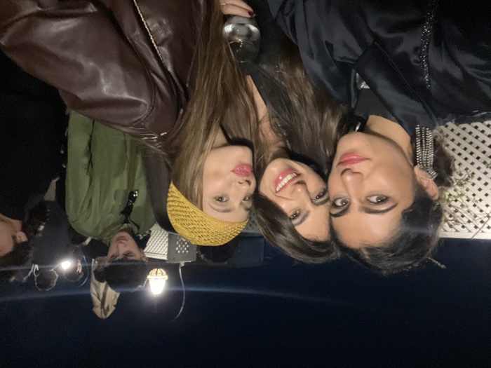Three women pose closely together for a photo, each facing the camera. One wears a yellow woven hat and a brown leather jacket is seen in the background. Another woman in the middle smiles broadly. The woman on the right wears dangling earrings and a black top. Other people, including a man in a green jacket, are partially visible in the background, along with a light fixture. The photo seems to be taken outdoors at night, with a dark sky.
