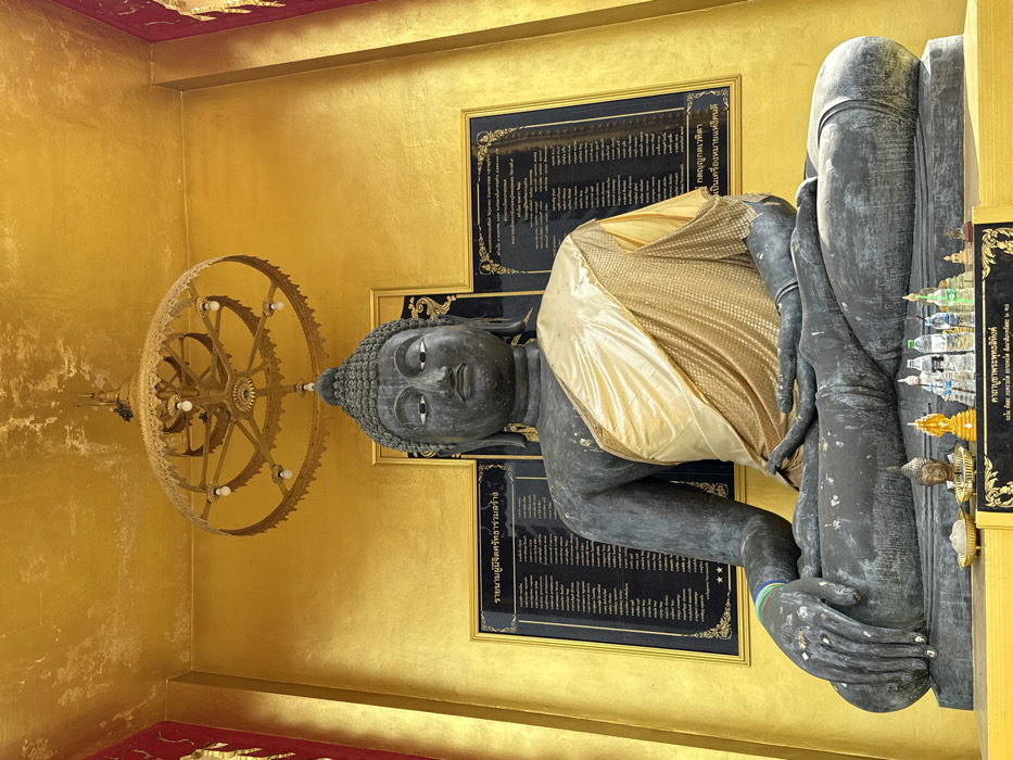 - "A large, dark-colored Buddha statue is seated centrally in a meditative posture, with hands resting in its lap, the right over the left" by FM-G5k3Y2, licensed under CC BY 4.0