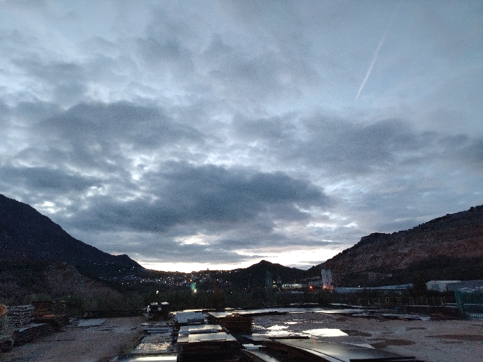 The image depicts a landscape under a cloudy, dusk sky. Two hills frame a distant town with faint lights. In the foreground, stacked metal sheets are scattered across a wet, uneven surface. A contrail cuts through the upper right sky. The lighting suggests either early morning or late evening.