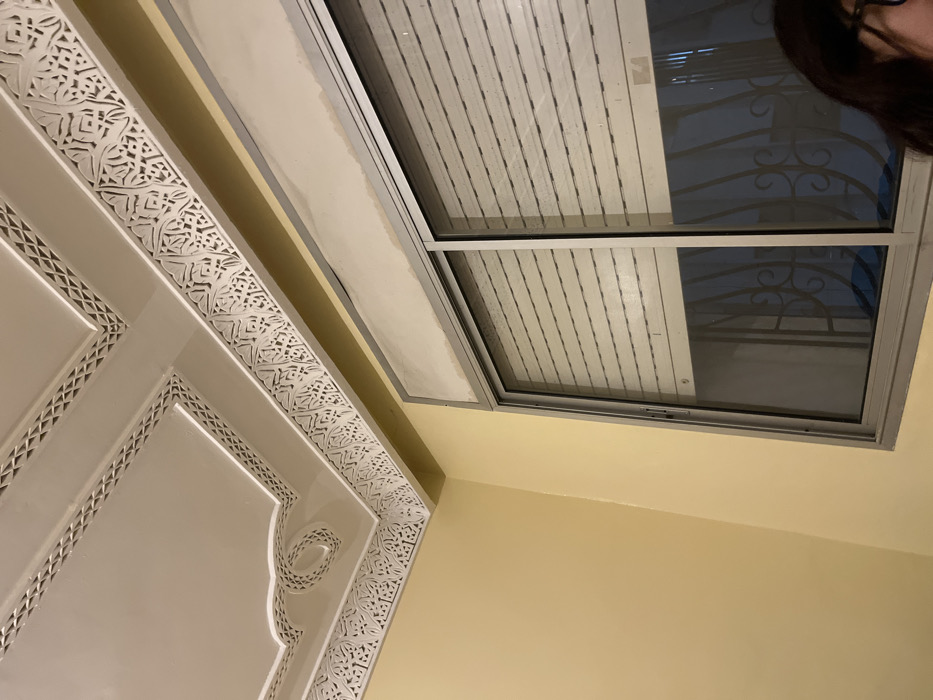 An angled view showcases a beige room, highlighted by a window with gray framing and divided panes, some with opaque blinds. Adjacent to the window, an intricately designed white door frame with geometric and floral carvings extends into the scene. A glimpse of a person's hair and glasses is visible in the window's reflection.