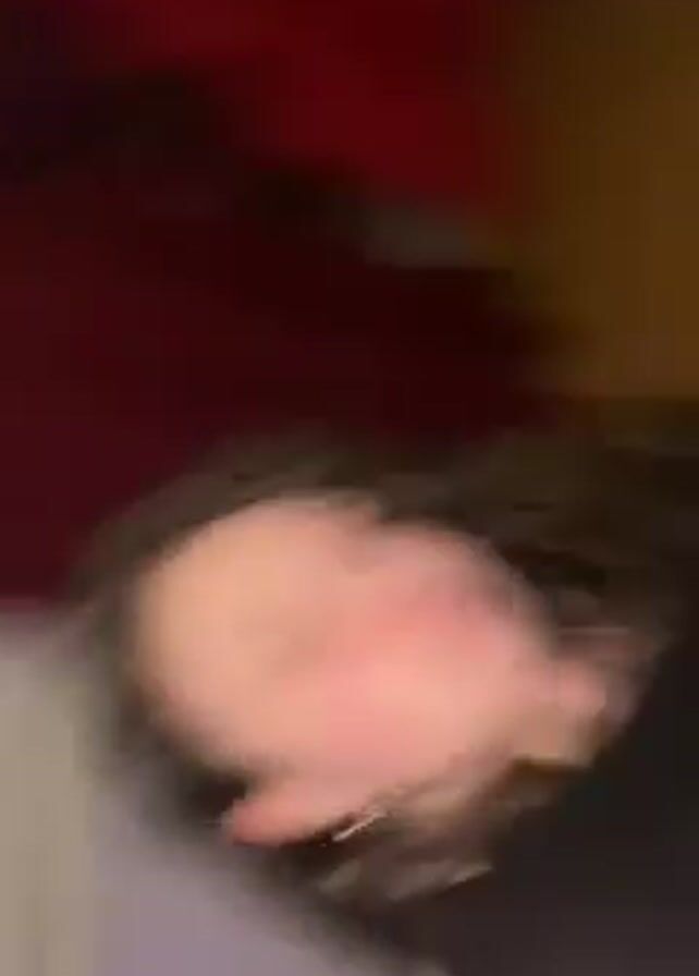 three people in an indoor setting, possibly a home. Initially, a young man is visible on the left, smiling. In the background, a young woman holds a mobile phone, seemingly recording. The camera then shifts to show another woman in the foreground with her back to the camera. The scene quickly changes, and a woman with long dark hair is shown lying down, with her face visible and partially obscured by dark hair. Another brief shot shows a blurred figure in a red top. The details of the environment are indistinct, though walls and some decorations are visible. The actions appear casual, but the exact nature of the interaction is unclear.