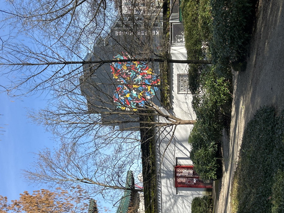 A building with white walls and a gray upper section displays a colorful mural. "KEEFER HOUSE" is written on the gray part. A tree with bare branches stands in front of the building, partly obscuring the view. Red framed window or door is seen on the lower white section. Green bushes grow alongside a pathway on the right. More trees and blue sky are visible in the background.