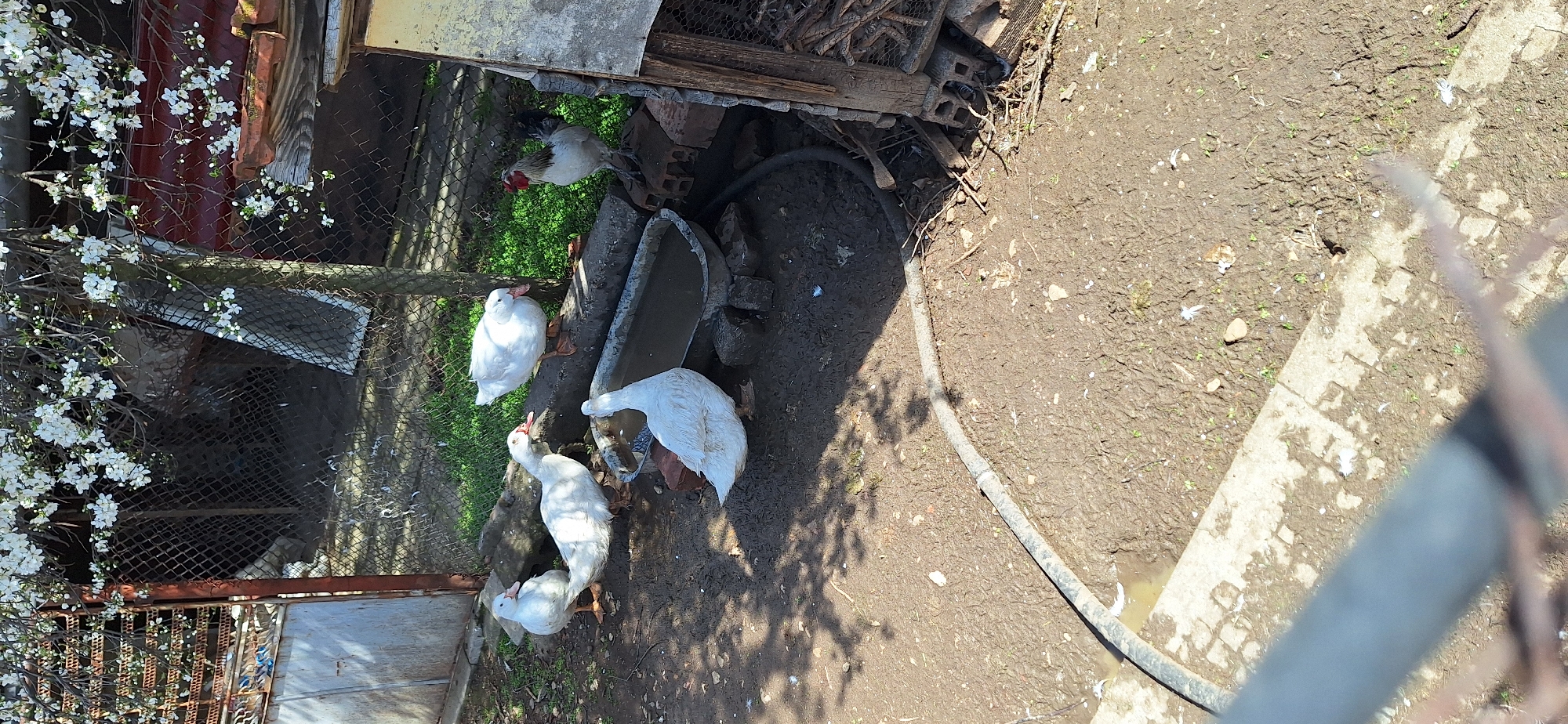 The image displays an outdoor, unpaved area in Letnitsa, Bulgaria. Five domestic fowl are present: four white ducks and one white and grey rooster. A dark, oblong metal trough, approximately half-filled with murky water, rests on several bricks in the center-right. One white duck stands with its back to the camera, head lowered towards the trough. Another white duck stands to the left of the trough, facing right with its beak slightly open. A third white duck is positioned further left, facing right on the muddy ground. A fourth white duck stands on a concrete block immediately to the right of the trough, facing left. To the far right, a white and grey rooster with a prominent red comb and wattles stands atop a stack of concrete blocks, facing left towards the ducks and trough. The ground is composed of reddish-brown soil and mud, showing numerous imprints and scattered white feathers. A dark, flexible hose lies across the muddy ground in the lower middle and right portions of the frame. A light-colored concrete border or pathway is visible along the bottom left edge. In the background, a wire mesh fence extends horizontally across the scene. To the far left, a light-colored metal gate with a rusty frame is partially visible, connected to the fence. Above the fence, from the upper left, branches of a tree or shrub with abundant white blossoms overhang the scene. Patches of green grass are visible directly behind the water trough and the fence line. To the far right, a dilapidated wooden structure with wire mesh and concrete block foundations is partially visible. The scene is under strong sunlight, casting distinct shadows from the fence and overhead branches onto the ground.