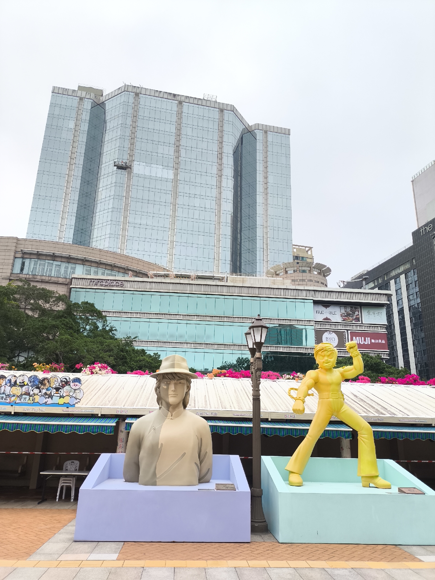 two statues standing in front of a row of shops and a tall glass building, likely in Hong Kong, China. The statue on the left is a beige bust of a man wearing a hat and a traditional Chinese garment, set in a lavender base. The statue on the right is a yellow figure of a man with his fist raised in the air, set on a light blue base. Between the statues is a black lamppost. Behind the statues is a row of shops with a white awning decorated with pink flowers and various signs and advertisements, written in Chinese and English. In the background is a large, modern glass building with the name "miraplace" visible on one of the lower levels. A construction lift or cleaning platform is visible on the building's exterior. Part of another building is visible to the right, marked "the". The statues stand on a paved area with brown and yellow tiles. The sky above is overcast.