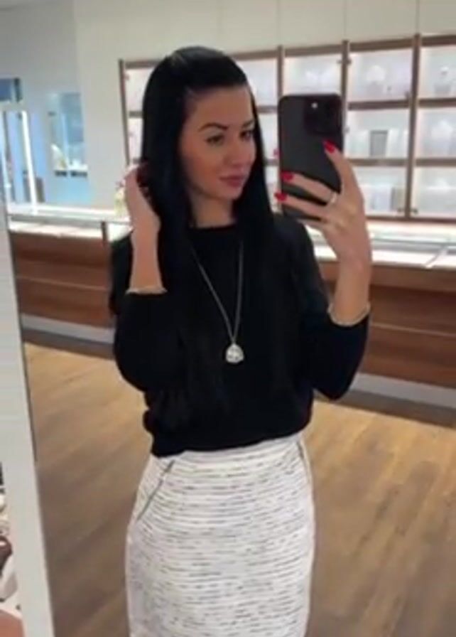 A woman is taking a selfie in a mirror in a store. She is wearing a black long-sleeved shirt, a white and gray striped skirt, a long silver necklace with a pendant, and two gold bracelets. She has long black hair and red nail polish. She is looking at her phone, which is a dark color. The store has wooden floors and cabinets with jewelry on display behind her. There is a security camera in the upper right corner of the frame.