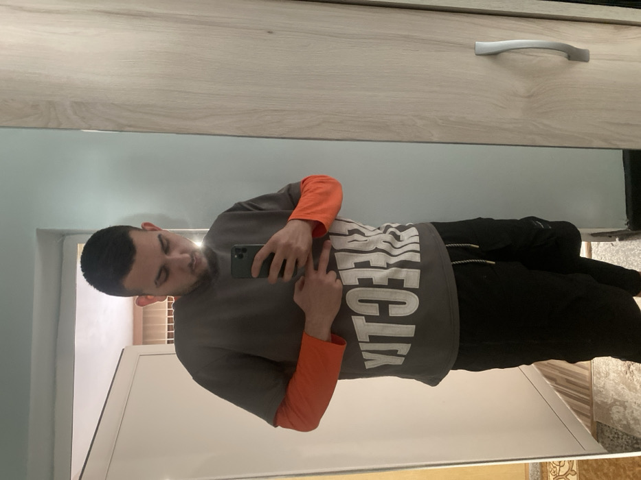 A male individual is depicted taking a mirror selfie indoors in Kovachevo, Bulgaria. The subject, who has short dark hair and a beard, is facing a mirror, holding a dark-colored smartphone with his right hand at chest level. His left hand is positioned near his stomach, with the index and middle fingers extended upward in a "V" gesture. He is wearing an orange long-sleeved shirt under a grey short-sleeved t-shirt featuring a distorted white graphic text, which reads as "YTCELLE" or similar, reversed by the reflection. Black drawstring pants with a visible cargo pocket on the left leg complete his attire. The background, a reflection, shows a light blue wall to the left of the subject and a light wood-grain cabinet or wardrobe door with a silver-colored handle to the right. A white door frame is partially visible on the far left, beyond which an adjoining interior space with patterned floor tiles is reflected.