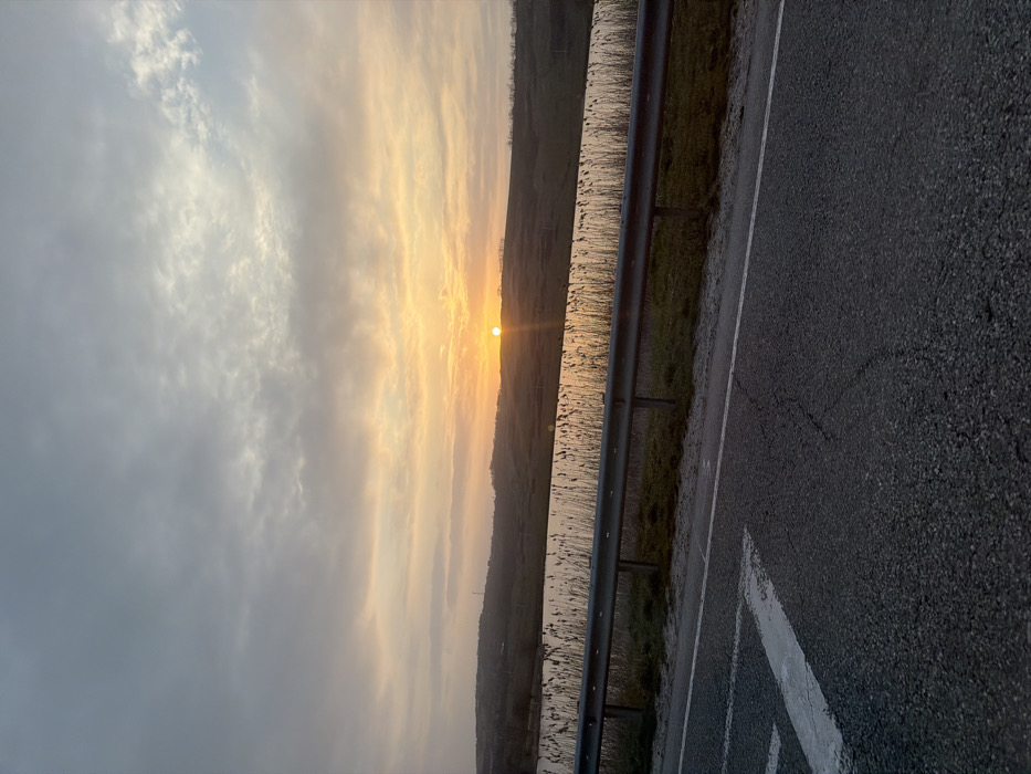 An outdoor scene captured at either sunrise or sunset in Gostagaevskaya, Russia, depicts a rural landscape from the perspective of a roadside