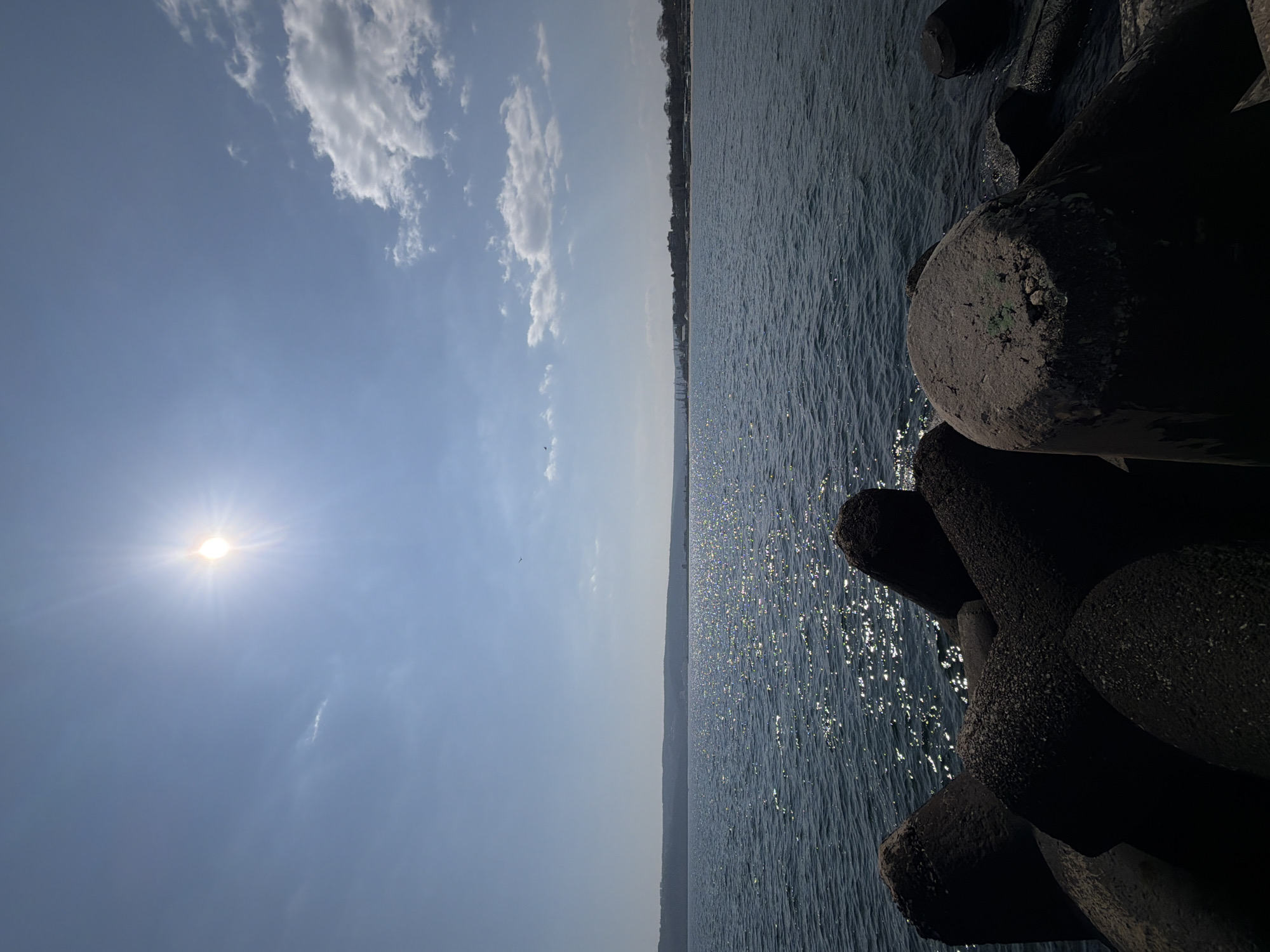 The image depicts a sunlit coastal scene in Varna, Bulgaria, observed from a breakwater. In the foreground, several large, dark, textured concrete breakwater blocks are partially submerged at the water's edge, occupying the lower third of the frame. One block in the immediate foreground exhibits a small patch of green discoloration on its flat top surface. The midground features dark blue-grey sea water with numerous bright, shimmering reflections from the sun, indicating surface ripples. The horizon line is visible across the upper midground. To the left, a distant landmass of hills or cliffs extends. To the right, a city skyline is visible, characterized by buildings, structures, and industrial cranes consistent with a port area, adjacent to a lighter-colored beach. The sky is predominantly clear blue, with scattered white cumulus clouds present, mainly in the upper right quadrant. The sun is a bright, starburst-like light source in the upper center-right, casting strong glare. Two small, dark avian figures are discernible in the sky, suggesting birds in flight. No human subjects, explicit actions, or direct interactions are observed.