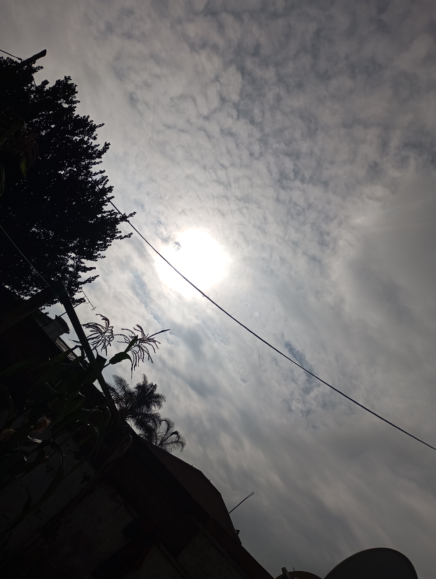 This upward-angled photograph captures a sunlit, cloud-filled sky over what appears to be a residential or mixed-use area in Johannesburg, South Africa. The sun is visible in the upper-middle left, partially obscured by widespread stratocumulus clouds that cover the entire sky. All foreground elements are heavily silhouetted against the bright backlight. In the upper left, the dense canopy of a large, leafy tree is prominent. Below and slightly to the right of this tree, several stalks of corn (maize) plants are visible, characterized by their distinct tassels. Further to the lower right, the fronds of palm trees are silhouetted. A dark utility cable stretches diagonally from the upper left quadrant across the sun towards the lower right. In the lower right corner, two circular satellite dishes are clearly silhouetted, positioned on what appears to be a rooftop or elevated structure, alongside a smaller, rod-like antenna. Dark silhouettes of building structures, including a section of a pitched roof and walls, occupy the lower left of the frame. No individuals are present, and no actions or interactions are depicted. The scene is illuminated by natural daylight, with a strong backlighting effect.