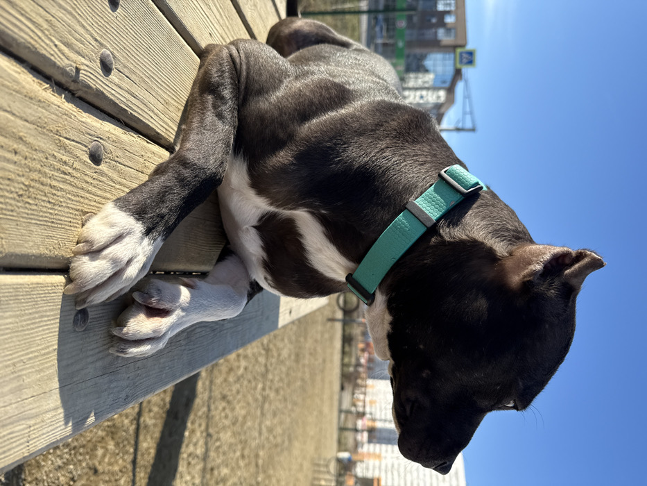 - "A black and white Pitbull-type dog is resting on a light-colored wooden bench, facing right in a profile view" by FM-Q0AMB2, licensed under CC BY 4.0