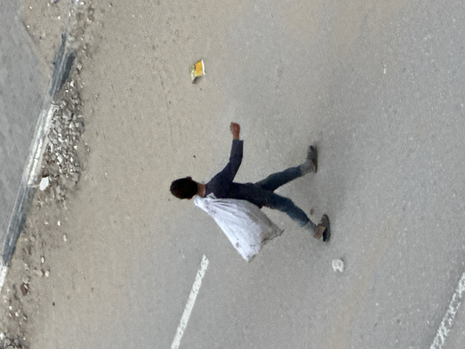 An elevated view captures a young individual, likely male, walking across a grey paved road in Khan Yunis, Palestinian Territory. The individual is seen from behind, wearing a dark long-sleeved shirt, dark trousers, socks, and dark slip-on shoes. A large, white, seemingly full sack is slung over their left shoulder. Their right arm is bent at the elbow, with the hand forming a fist. To the left, a broken white lane marking is visible on the road surface. The road's edge to the right transitions to a dirt and gravel shoulder, partially delineated by a dark grey curb, with scattered debris including small rocks and concrete fragments. On the road surface, near the individual's feet, is a small crumpled white object, and further to the right, a crumpled yellow and brown wrapper is visible. The scene is illuminated by natural light, suggesting daytime.