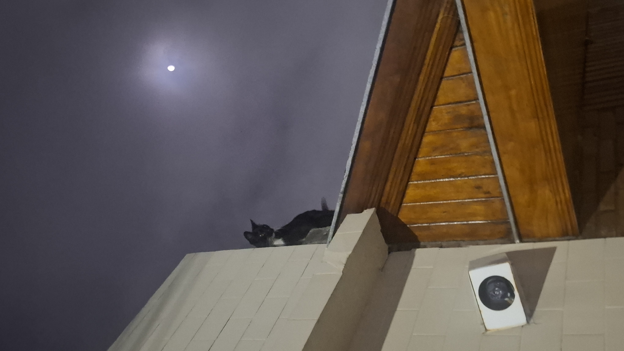 The image, taken at night in Wilde, Argentina, shows a black and white cat on a rooftop. The moon is visible in the upper left of the frame. The rooftop is tiled in a light color, and a security camera is mounted on the wall beneath the roof's edge. A wooden triangular structure, possibly part of the roof's design, is located to the right of the cat. The sky is dark with a diffused glow around the moon.