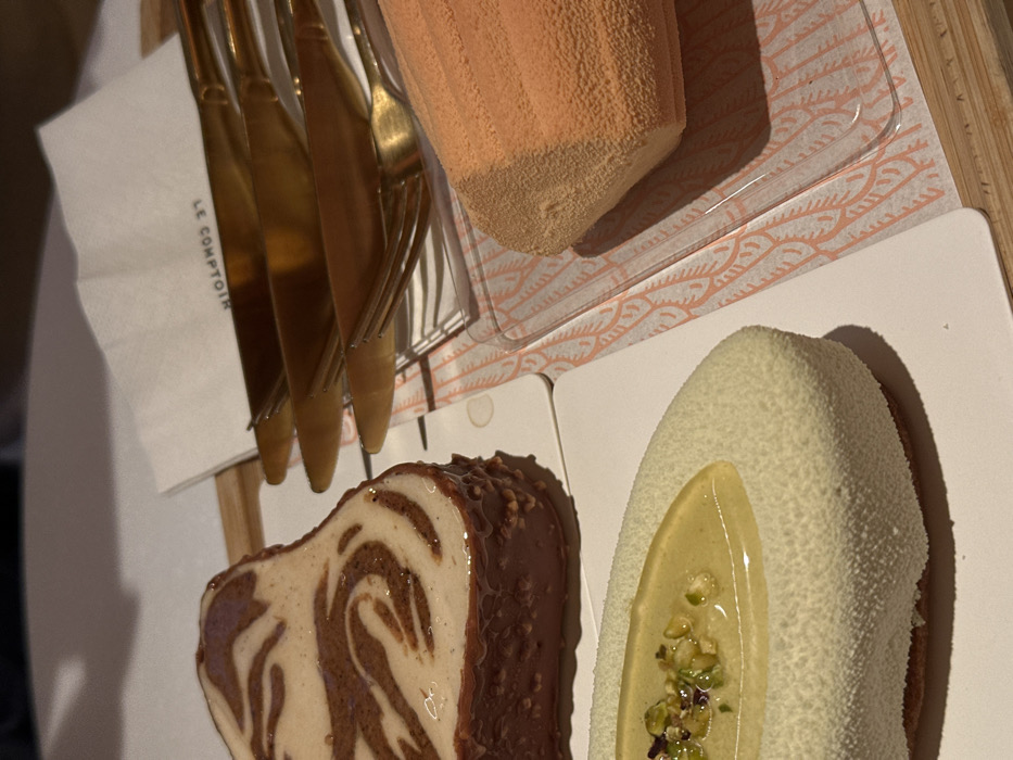 The image displays a close-up view of three gourmet desserts and table settings arranged on a light wooden surface, indicative of a patisserie or cafe. In the upper right, a white paper napkin is visible, bearing the dark text "LE COMPTOIR" printed upside down. Resting upon this napkin are four pieces of gold-colored cutlery: two forks and two knives, placed parallel to each other. To the upper left, a rectangular dessert or entremet features a dark, textured base, possibly coated in chocolate with nuts, topped by a glossy, light-colored layer with prominent dark brown marble or swirl patterns. This dessert is positioned on a white rectangular cardboard plate. In the lower left, an oval-shaped dessert is presented. It has a matte, white, velvety spray coating. A central, elongated depression on its surface is filled with a pale yellowish-green gel or glaze, garnished with chopped green pistachios and minor darker particulates. This dessert also rests on a white rectangular cardboard plate. To the right, an orange-colored, cylindrical dessert with a matte, velvety spray coating is situated. It is contained within a clear, shallow plastic tray which rests on a light orange paper liner adorned with a repeating, stylized, curved pattern. The background is uniformly blurred, suggesting an indoor setting with diffused lighting. The textual clue "LE COMPTOIR" combined with the distinctive, high-quality pastry presentation indicates the establishment is "Le Comptoir," strongly suggesting "Le Comptoir by Cyril Lignac," a renowned patisserie in Paris, France.