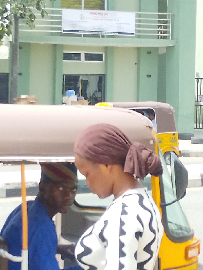 The image depicts a daytime street scene in Babban Giji, Nigeria. In the background, a two-story building with light green exterior walls is visible. A white sign reading "EMK Nig Ltd" is affixed to the upper facade, above a set of horizontally oriented windows. The ground floor features a dark entrance or large windows, with various items, including what appears to be cardboard boxes, positioned on a low surface in front of it. In the midground, two auto-rickshaws (locally known as Keke Napep) are present. The closest one features a tan or light brown canopy, largely obscuring its base. Behind it, a yellow auto-rickshaw with a matching brown canopy is partially visible, displaying "GAAO" or similar text on its side. In the foreground, two individuals are partially visible. On the right, a female is depicted in profile, looking downwards. She wears a brown headwrap and a white top with a distinct black wavy pattern. On the left, a male is seated, partially obscured by the auto-rickshaw structure. He wears a blue traditional garment and a cap with red, white, and blue stripes. His gaze is directed forward or slightly towards the female. No direct interaction between the two foreground individuals is discernable. The scene is brightly lit, indicative of daylight.