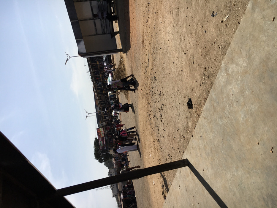 This image captures an active, open urban scene under a clear, bright sky, identified as a location within Jos, Nigeria