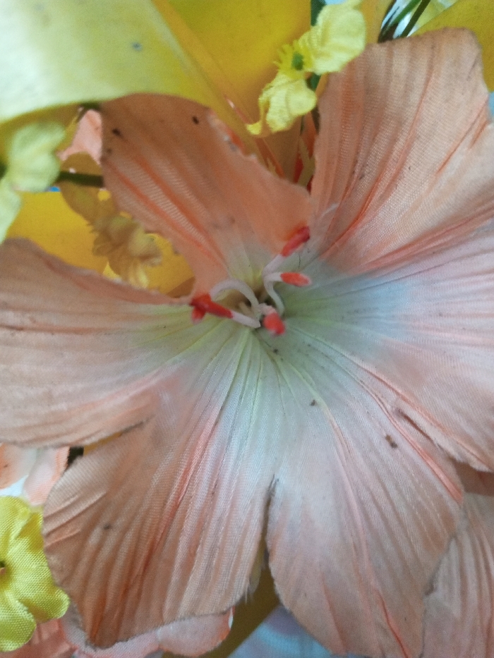 A close-up shot reveals a peach-colored flower with pronounced linear textures on its petals. The flower's center exhibits a green hue with red accents. Smaller, yellow flowers surround the main bloom, set against a yellow backdrop. The artificial or fabric nature of the flower is evident in the petal's texture. Light reflects subtly on the petals, enhancing their form.