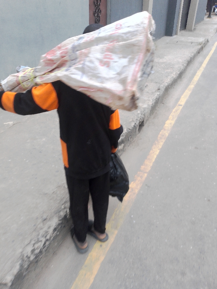 A person walks along a street carrying a large white bag over their shoulder, obscuring their head. They wear a black and orange jacket, black pants, and dark sandals. A black trash bag is held in one hand. The street has a concrete curb and a yellow line marking the edge. Buildings are visible in the background. The scene appears to be outdoors during the day.