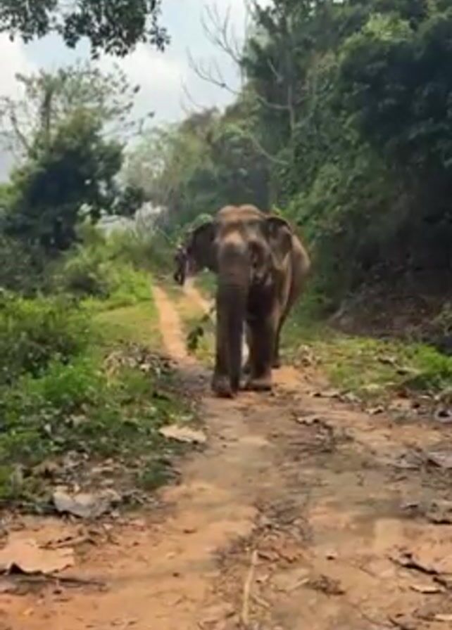 An Asian elephant walks forward on a dirt path in a wooded area. The elephant is large and gray-brown, with tusks. It has a leafy branch in its mouth, which it holds with its trunk. The path is narrow, dirt colored, and flanked by greenery on both sides. The background has thick trees and some mountains or a large hill in the far distance. People can be heard talking in the background.
