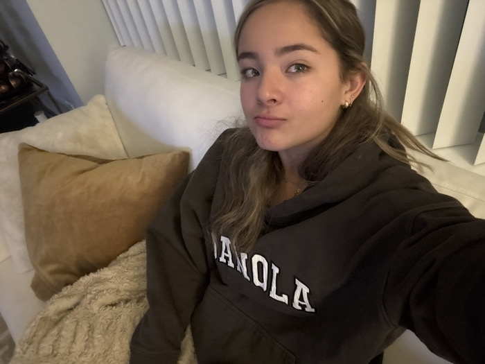 A young woman is sitting on a white couch with a brown hooded sweatshirt with “MANOLA” printed on it. She is looking at the camera with a slight pout. Behind her, there are closed white blinds. There are two pillows and a textured throw on the couch next to her. There is a side table with dark objects sitting on it behind the couch. She has light brown hair. She is wearing small gold hoop earrings.