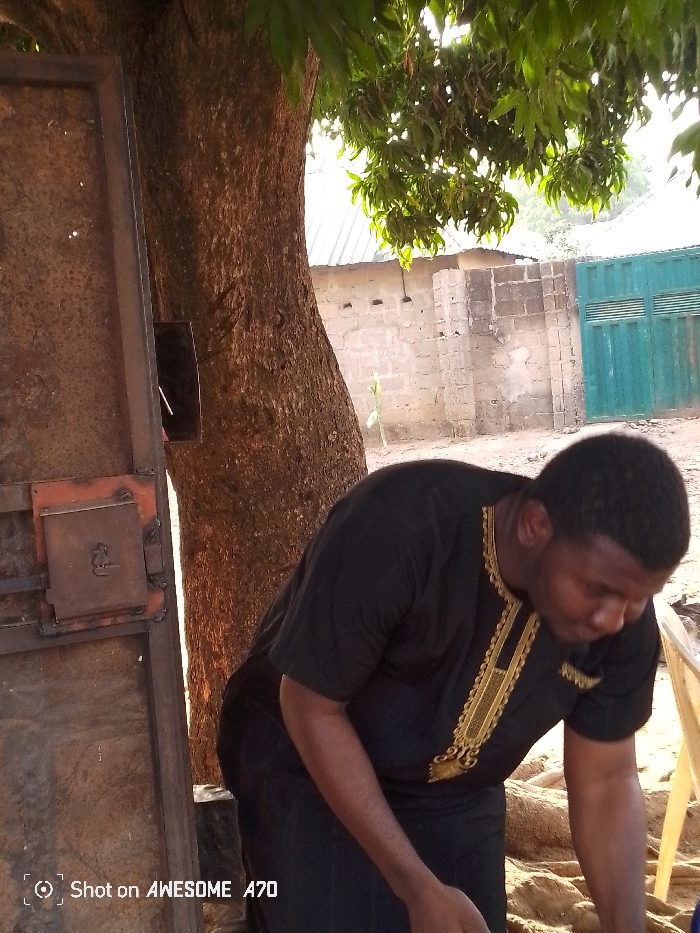 A man in a black shirt with gold trim is standing near a tree. He is bent over, facing downward. To his left is a brown metal structure, and in the background is a wall and a teal gate. The tree has lush green leaves overhead, casting shadows on the scene. The photo is taken outdoors, with a slightly overexposed quality. A watermark is visible in the lower-left corner.
