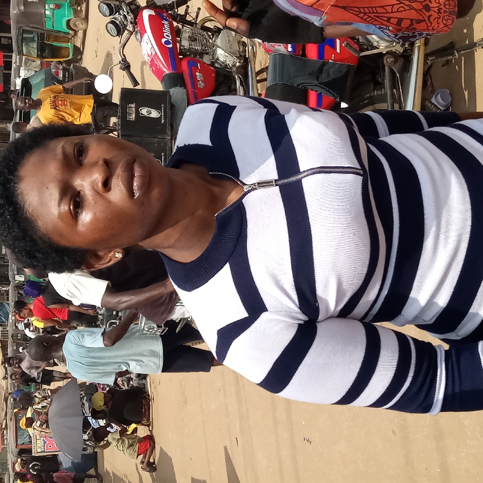 The scene depicts a bustling outdoor environment in Umuode, Nigeria, characterized by a concentration of people and vehicles on an unpaved, light brown surface. In the foreground, a female subject with dark, short, curly hair and brown skin faces slightly right of the camera, presenting a neutral expression. She wears small gold-colored stud earrings and a long-sleeved top featuring horizontal navy blue and white stripes with a silver-colored zipper extending down the chest. To her immediate right, a partial view of another individual's arm, clad in a multi-colored garment, is visible. Behind the primary subject, a red and silver "Colink ISP 150" motorcycle is parked, its rear rack secured with a black crate bearing "NB" (Nigerian Breweries) labeling. The midground and background are populated with numerous individuals and various vehicles. A person in a light blue t-shirt and dark shorts is visible behind the primary subject, moving towards the left. Further back, a person in a yellow t-shirt with "BADASS" printed on it is also visible. To the left, a person kneels or squats under a black umbrella, adjacent to another individual seated on the ground, suggesting a roadside vendor or informal gathering point. A partially visible sign displaying "METRO EXTREME" is present in the left background. Several three-wheeled auto-rickshaws and other vehicles are visible in the distance, indicating a busy street or market area.